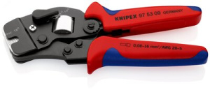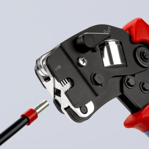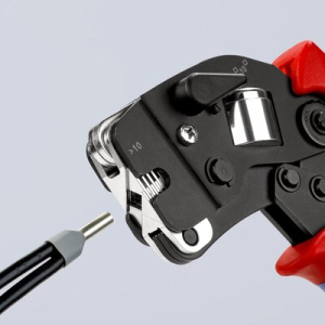 Самонастраивающиеся пресс-клещи для опрессовки контактных гильз для опрессовки контактных гильз (по стандарту DIN 46 228 часть 1 + 4). саморегулирующаяся настройка на нужный размер контактной гильзы - исключаются ошибки опрессовки из-за неверного выбора опрессовочной плашки. Вставка втулок в клещи спереди. неизменно высокое качество опрессовки за счет принудительной блокировки (с отпиранием). усилие опрессовки точно откалибровано изготовителем. высокая передача усилия благодаря рычажному механизму, для снижения усталости при работе. инструмент удобен в использовании благодаря продуманной конструкции и малому весу. oпрессовка в диапазоне поперечных сечений 0,08 -10,0 мм.кв и 16,0 мм.кв в одной матрице. с рычагом выбора для установки диапазона опрессовки 0,08 - 10 или 16,0 мм.кв. Для двойных втулок 2 x 10 мм.кв до диаметр 6,6 мм