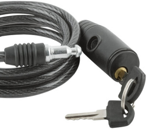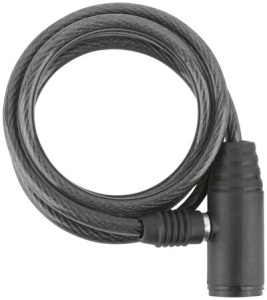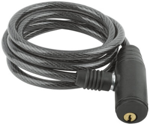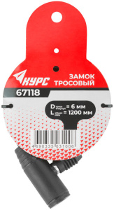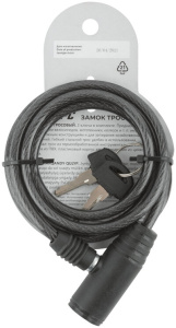 2 ключа в комплекте. Предназначен для фиксации велосипедов, мототехники, колясок и т.п. имущества к неподвижным конструкциями для запирания хозяйственных помещений. Материал - трос из инструментальной стали, оплетка из ПВХ, пластиковый корпус замка, сердечник из цинкового сплава. Упаковка - картонный подвес.