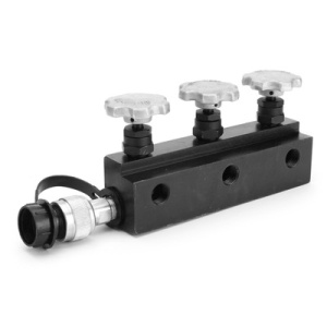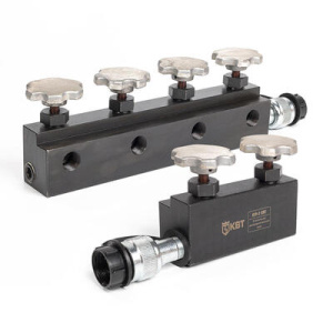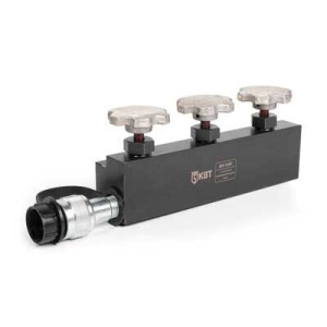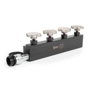 Возможность подсоединения нескольких гидравлических устройств к одной помпе с одновременной или попеременной подачей рабочей жидкости. Конусные краны. Мощный кран гарантированно выдерживающий давление 70 МПа, Резьбовые соединения - К 3/8' по ГОСТ 611-52. Совместимость - любое гидравлическое оборудование производства 'КВТ'
