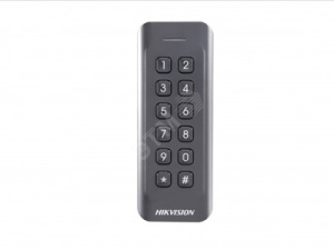 Hikvision DS-K1802МК - считыватель Mifare карт с механической клавиатурой. Частота считывания 13,56 МГц. Дальность считывания больше или равна 50 мм. Поддержка протокола Wiegand (W26/W34). Питание DC12В, 2Вт. Рабочие условия от -40C до +70C. Защита IP65. Размер 115.9х43.3х17мм. Материал корпуса пластик.
