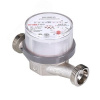 Водосчетчик универсальный - для измерения расхода холодной и горячей воды, главным образом - в квартирах. Условный диаметр модели - 1/2`, номинальный расход воды - 1.5 куб. м/ч. Длина прибора без сгонов - 110 мм. Резьба присоединительных патрубков - 3/4`. Межповерочный интервал - 6 лет (на холодную и горячую воду).