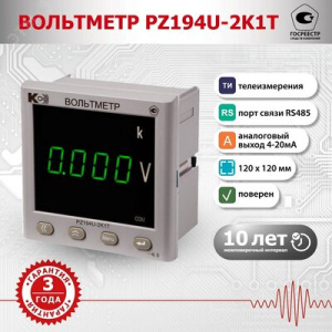 Одноканальные вольтметры PZ194U-2K1T предназначены для измерения напряжения и частоты переменного тока в электрических цепях. Приборы используются на предприятиях электроэнергетики, промышленности и коммунального хозяйства. Прибор производится c портом связи RS-485 (протокол Modbus RTU). Четыре кнопки на лицевой панели для просмотра на индикаторе измеряемых величин и настройки прибора (вход в меню настройки защищен паролем). Так же настройка возможна при помощи программы iPMS. Сервисная программа iPMS для настройки и юстировки приборов, просмотра и накопления результатов измерений. Настройка диапазона показаний прибора с учетом примененного на его входе измерительного трансформатора.