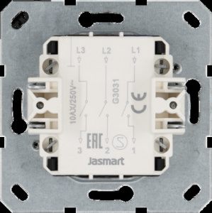 Механизм выключателя 3-клавишного Jasmart серии ''G'' в цвете антрацит подходит для сетей 250 В, на ток 10 А. Трехклавишный выключатель позволяет управлять трмя источниками света с одной точки. Лицевые детали из качественного поликарбоната, устойчивого УФ-излучению.