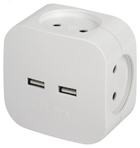 Тройник (адаптер) ЭРА с 4-мя розетками и 2-мя USB гнездами для зарядки портативных устройств. Новые тройники с USB собственного дизайна ЭРА отличаются эргономичным конструктивом и удобством в использовании. Идеален для зарядки мобильных телефонов и планшетов. Незаменим с собой в дороге. Особенно актуален, когда в помещении мало источников подключения - можно из одной розетки сделать четыре и при этом ещё заряжать 2 устройства одновременно через USB. Максимальная мощность USB разъемов: 2400 мА. Разветвитель сетевой в форме кубика с закруглёнными углами выглядит оригинально и отличается компактностью. Розетки утоплены в корпус, благодаря чему вилка плотно сидит в гнезде. Под USB-портами - объёмный логотип ЭРА. Разветвитель-кубик ЭРА в белом цвете - арт. Б0049532, в чёрном цвете - Б0049536.