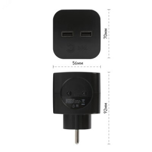 Разветвитель электрический SP-2-USB-B на 2 розетки + 2xUSB 2400mA, без заземл 10А (черный)
