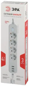Сетевой фильтр ЭРА USF-4es-3m-3xUSBA-W с заземлением, с выключателем, 4 розетки, 3USB, провод 3м, ПВС 3x0,75мм2. Базовый уровень защиты техники: от импульсных помех, от перегрузки, от короткого замыкания. Максимальная мощность 10А/2200 Вт. Корпус из негорючего пластика (полипропилен). Вилка обеспечена кольцом для удобного извлечения ее из розетки. Выключатель со световой индикацией позволяет выключить все приборы, подключенные к сетевому фильтру, не вынимая вилки из розетки. Отлично подойдет для защиты бытовой и компьютерной техники. Сетевой фильтр оснащен 3USB для зарядки мобильных устройств.