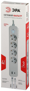 Сетевой фильтр ЭРА USF-4es-3m-2xUSBAC-W с заземлением, с выключателем, 4 розетки, 2USB, провод 3м, ПВС 3x0,75мм2. Базовый уровень защиты техники: от импульсных помех, от перегрузки, от короткого замыкания. Максимальная мощность 10А/2200 Вт. Корпус из негорючего пластика (полипропилен). Вилка обеспечена кольцом для удобного извлечения ее из розетки. Выключатель со световой индикацией позволяет выключить все приборы, подключенные к сетевому фильтру, не вынимая вилки из розетки. Отлично подойдет для защиты бытовой и компьютерной техники. Сетевой фильтр оснащен 2USB для зарядки мобильных устройств.