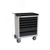 Шесть ящиков – четыре малых и два больших. Закрываются на общий центральный замок. Все колеса поворотные, два из них с тормозом. Укомплектована лотком с противоскользящим ковриком и эргономичной ручкой.