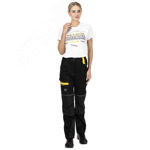 Брюки эргономичной формы с застежкой на гульфик с молнией и джинсовую пуговицу на поясе. Пояс со шлевками для фиксации ремня. Шлевка спереди с пластиковым полукольцом для крепления карабина или пропуска. Сзади – большая шлевка из стропы контрастного цвета. На передних половинках верхние карманы с боковым входом и карманы для амортизационных вкладышей в области колен на липучках. Боковой накладной карман с клапаном на липучке и карманом на молнии для мелких предметов в области середины бедра. На задних половинках кокетки, верхние накладные карманы с объемом в нижней части. Световозвращающие канты для обеспечения безопасности в условиях плохой видимости. В области колен и по низу брюк – накладки из ткани устойчивой к истиранию.