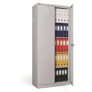 Металлический шкаф с 4 полками. Можно установить дополнительные полки. Максимальная нагрузка на полку — 60 кг, шаг регулировки — 50 мм. Ригельная система запирания.