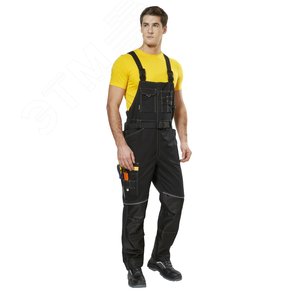 Полукомбинезон с яркими элементами фурнитуры и множеством функциональных деталей и карманов: боковой карман на брюках спереди с отделом для инструментов, задние накладные карманы, карманы с наклонным входом, карманы спереди для документов, телефона и мелких деталей, усилительные накладки в области коленей и по низу из отделочной прочной ткани, карманы на коленях для амортизационных вкладышей, световозвращающие канты спереди и сзади, застежка на молнию под планкой, широкая шлевка на липучке сзади для фиксации съемного пояса с карманами, регулировка объема по талии за счет эластичных вставок по бокам, длина лямок регулируется за счет пластиковых пряжек и эластичных вставок на спинке, съемный пояс из ременной стропы на пластиковой пряжке с навесными карманами с отделениями для мелких деталей и рабочих инструментов.