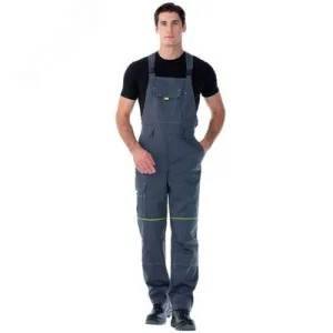 Полукомбинезон с регулируемыми по длине бретелями, с гульфиком с застежкой на петли и пуговицы. Пояс со шлевками для ремня и с эластичной кулисой по спинке для регулировки объема. На грудке - накладной вместительный карман с отделением для ручки. На передних половинках - верхние карманы с боковым входом, на задних половинках - верхние накладные карманы с объемом в нижней части, левый карман с клапаном. На правой брючине сбоку на уровне середины бедер - накладной карман с клапаном и малым накладным карманом с отделениями для мелких инструментов. Усилительные накладки в области коленей и карманы для амортизационных вкладышей под ними. Яркие канты над коленями.