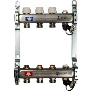 Блок коллекторный с ручными регулировочными клапанами 1'x3 выходов 3/4' НР евроконус с воздухоотводч