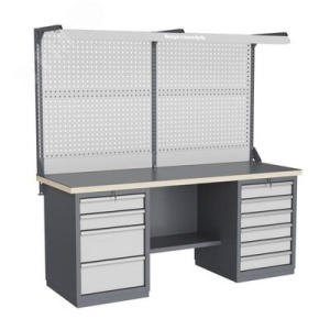 Столешница верстака изготавливается из шлифованной влагостойкой фанеры, которая покрыта лаком-антисептиком. Сверху на фанеру установлена стальная наладка. Верстак может комплектоваться одинарным или двойным перфорированным экраном, электромонтажным блоком для установки розеток и дополнительных устройств, а также комплектом освещения с держателем и лампой. Перфорация экрана подходит под стандартные держатели для инструментов, отверток, крючков, полок. Возможна комплектование верстака навесным элементами (держатели, крючки, полки). Все металлические части верстака покрыты ударопрочной и износостойкой порошковой краской.