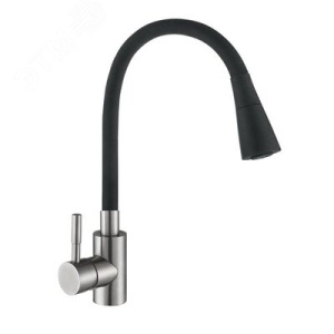 Смеситель для кухни АНТЕЙ, серия Мармелад. Корпус нержавеющая сталь (SUS304). Цвет сатин + черный. Картридж 35 мм, с керамическими пластинами. Излив высокий, поворотный, гибкий, силиконовый. Высота (корпус + излив) 330 мм. Аэратор 2-х режимный, переключение реж. (душ/поток) поворотом.