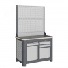 Все металлические элементы покрыты полиэфирной порошковой краской, обеспечивающей хорошую износостойкость покрытия и невосприимчивость его к моющим средствам и смазочным веществам. Верстак имеет декларацию соответствия ТР ТС 025/2012 О безопасности мебельной продукции. Верстак имеет сертификат соответствия ГОСТ Р 58863-2020 Столы производственные. Верстаки из металла. Общие технические условия. Столешница состоит из листа влагостойкой фанеры марки ФСФ толщиной 40 мм, которая покрыта лаком-антисептиком и листом горячекатаной стали толщиной 5 мм. Максимальная масса груза, составляет 1500 кг. Модуль верстака выполнен сварными. Ящики в модулях устанавливаются на шариковых телескопических направляющих полного выдвижения. Модули с ящиками снабжены общим центральным замком с поворотом ригеля 180 градусов и подпружиненной тягой. В комплекте два ключа для каждого замка.