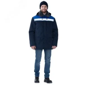 Куртка мужская утепленная с контрастной кокеткой, с кулисой по талии для регулировки объема. Супатная центальная застежка на пуговицах. Воротник отложной с искусственным мехом. Капюшон пристегивается с помощью пуговиц. Куртка с накладными карманами - 2 нижних кармана с клапанами, 1 нагрудный. Рукава втачные двухшовные с внутренней трикотажной манжетой. Спереди и сзади вдоль кокеток световозвращающие полосы 5 см шириной для безопасной работы в условиях плохой видимости.