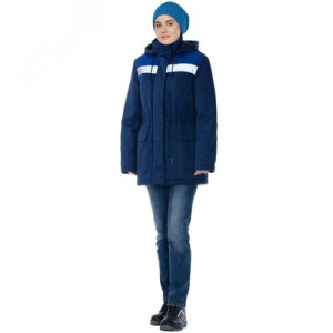 Куртка женская прямого силуэта с центральной застежкой на тесьму-молния под планкой на липучках. Верхние кокетки переда и спинки выполнены из ткани контрастного оттенка. По низу кокеток расположены широкие световозвращающие полосы. Полочки с нагрудными вытачками, верхним накладным карманом с отделением для ручки и двумя нижними накладными карманами с клапанами на липучках. Воротник - стойка. Рукава втачные с внутренними трикотажными манжетами для сохранения тепла. Капюшон съемный, на тесьме-молнии, с регулировкой объема по лицевому вырезу кулисой со шнуром и по затылочной части - хлястиком на липучке.