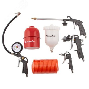 "Набор пневмоинструмента Matrix 57304 включает 5 предметов- промывочный пистолет, продувочный пистолет, пневмопистолет для накачки шин, краскораспылитель с верхним бачком и шланг с быстросъемным соединением. Пневмоинструменты совместимы со всеми типами компрессоров. Набор пригодится в автомастерской, на мебельном производстве, в гараже или при проведении ремонта. С помощью краскораспылителя можно покрасить поверхности или покрыть их защитными составами. Промывочный пистолет предназначен для очистки и смазки различных поверхностей. Пистолет для подкачки шин позволяет измерить давление в шине и накачать ее. Продувочный пистолет очищает поверхности и детали струей сжатого воздуха, а спиральный шланг служит для подключения пневмоинструмента к компрессору."