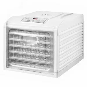 С электросушилкой Kitfort КТ-1907 у вас под рукой будет всегда живая еда. Прибор насушит на всю зиму помидоры, кабачки, баклажаны, клубнику, абрикосы, персики, тыкву, грибы, зелень, рыбу и многое другое. Сушилка оборудована большим мощным вентилятором, что обеспечивает равномерный горизонтальный обдув всех 6 поддонов. Поток воздуха направлен горизонтально, поэтому запахи продуктов с разных поддонов не смешиваются. На сушилке можно установить температуру сушки в диапазоне 35-70 °С с шагом в 5 градусов. Сушилка оснащена таймером до 19,5 часов с шагом 30 минут. 6 пластиковых поддонов, 6 поддонов с бортиками для пастилы и 6 сеток помогут разместить внутри сушки абсолютно любые продукты! Прибор имеет строгие формы и минималистичный стильный дизайн. Дверца полностью снимается, через неё удобно наблюдать за ходом сушки.