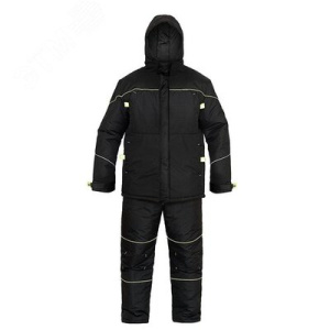 Куртка прямого силуэта. Спинка с отрезной кокеткой, в шов стачивания вставлен СВП кант лимонного цвета. В средней и нижней части внутренние карманы. Детали куртки – полочки, спинка из ткани флис, простеганы с утеплителем плотностью 300 г/м.кв. Рукава из подкладочной ткани простеганы с утеплителем 300 г/м.кв. Куртка застегивается на двух замковую молнию-трактор, верх молнии закрыт внутренней планкой с загибом на внешнюю сторону и образует стопор. Молния закрыта двумя планками на липучках. Полукомбинезон цельнокроеный по передней и задней части. На передней части находятся накладные боковые карманы на подкладке. Детали ПК из подкладочной ткани простеганы с утеплителем 300 г/м.кв. Застегивается по передней части на молнию.