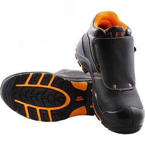 Ботинки ''Сварщика'' отлично подойдут для использования при сварочных работах. Обувь изготовлена методом прямого литья. Защитный кожаный клапан защищает шнуровку и фиксируется ремешком с пряжкой. Носок из поликарбоната обеспечивает защиту от ударов в носочной части 200 Дж и проколов. Материал верха обуви, термостойкая водоотталкивающая кожа толщиной 1,8 - 2 мм, со специальным покрытием, которая защищает от контактов с агрессивной средой- нефть, растворы кислот и щелочной концентрации до 20 процентов, общих производственных загрязнений. Подошва двухслойная, полиуретан и нитрильная резина, устойчива к контакту с нагретой поверхностью, до 300 градусов Цельсия, с улучшенным сопротивлением к скольжению и деформациям. Металлическая антипрокольная стелька обезопасит стопу ноги от порезов и проколов.