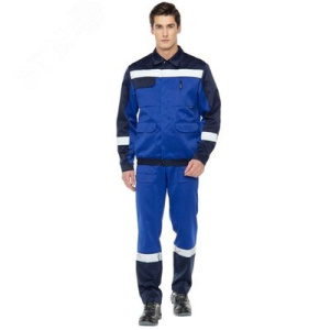Костюм состоит из куртки и полукомбинезона. Куртка с супатной застежкой на пуговицы и кнопки. Нагрудные накладные карманы с клапаном с объемом в нижней части и на молнии для персональных документов. Нижние накладные карманы с клапанами, со скрытой складкой для объема, чтобы снизить нагрузку на верхние края карманов и предотвратить их вырывание в процессе эксплуатации. Рукава втачные с верхней деталью из ткани отделки, с манжетами на кнопке. Полукомбинезон с застежкой на пуговицы в правом боковом шве и с гульфиком на молнии. Бретели с регулировкой длины и с застежкой на фастексы. На грудке вместительный карман на молнии. На передних половинках накладные карманы с усилением и скрытым объемом по низу. На задней правой половинке накладной карман со скрытым объемом по низу, карманы для различных мелких инструментов. По низу кокеток, на рукавах куртки и по низу полукомбинезона широкие световозвращающие полосы для безопасности при работе в условиях плохой видимости.