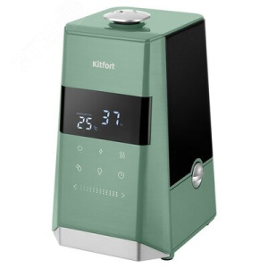Ультразвуковой увлажнитель воздуха КТ-3824 увлажняет воздух в помещении и ионизирует его, создавая хороший микроклимат. Прибор прост в эксплуатации и обслуживании, может использоваться в помещениях, площадь которых не превышает 35м?. Кнопка ''Подсветка'' включает и выключает подсветку корпуса. Кнопка ''Ионизация'' включает и отключает функцию ионизации воздуха. Кнопка ''Тёплый туман'' включает и отключает функцию ''Тёплый туман''. Кнопки пульта ДУ повторяют функции кнопок панели управления. Резервуар у модели съёмный, с ручкой. Он закрепляется на основании с помощью фиксатора. Устройство работает в автоматическом или ручном режиме. В автоматическом режиме прибор сам определяет необходимый уровень влажности в помещении, исходя из температуры воздуха. Индикация показывает, когда устройство включено и когда в увлажнителе нет воды.