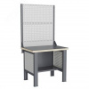 Столешница верстака изготавливается из шлифованной влагостойкой фанеры, которая покрыта лаком-антисептиком. Сверху на фанеру установлена стальная наладка. Верстак может комплектоваться одинарным или двойным перфорированным экраном, электромонтажным блоком для установки розеток и дополнительных устройств, а также комплектом освещения с держателем и лампой. Перфорация экрана подходит под стандартные держатели для инструментов, отверток, крючков, полок. Возможна комплектование верстака навесным элементами (держатели, крючки, полки). Все металлические части верстака покрыты ударопрочной и износостойкой порошковой краской.