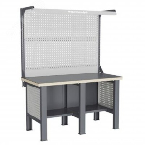 Столешница верстака изготавливается из шлифованной влагостойкой фанеры, которая покрыта лаком-антисептиком. Сверху на фанеру установлена стальная наладка. Верстак может комплектоваться одинарным или двойным перфорированным экраном, электромонтажным блоком для установки розеток и дополнительных устройств, а также комплектом освещения с держателем и лампой. Перфорация экрана подходит под стандартные держатели для инструментов, отверток, крючков, полок. Возможна комплектование верстака навесным элементами (держатели, крючки, полки). Все металлические части верстака покрыты ударопрочной и износостойкой порошковой краской.
