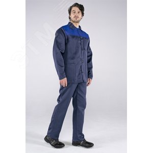 Куртка удлиненная, центральная застежка на петли и пуговицы, отложной воротник, кокетка контрастного цвета, нагрудный карман с открытым входом, нижние карманы с открытым входом, манжеты на пуговице. Брюки прямой силуэт, гульфик с застежкой на петли и пуговицы, пояс со шлевками под ремень, боковые карманы с наклонным входом.