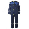 Ветрозащитная планка с застежкой на ленту-контакт. Воротник-стойка на флисовой подкладке, капюшон утепленный, съемный. Регулировка ширины изделия по талии куртки. Полукомбинезон утепленный, с центральной застежкой на тесьму ''молния''.Кулиса по талии спинки. Полукомбинезон на бретелях с эластичной резинкой. Полукомбинезон с различными многофункциональными карманами. Светоотражающие элементы лимонного цвета. В костюме используется светоотражающая полоса 50 мм.