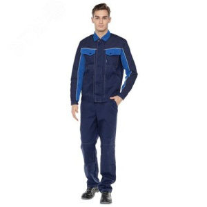 Рабочий мужской костюм состоит из куртки и брюк. Он выполнен из плотной ткани с высоким содержанием хлопка. Куртка прямого силуэта с отложным воротником и центральной застежкой на молнию под планкой на 2-х кнопках, нагрудными карманами с клапанами на кнопках и нижними вместительными карманами. Рукава у костюма рабочего втачные с манжетами на кнопках. Объем по низу куртки регулируется хлястиками. Брюки с гульфиком на молнии и поясом на пуговице со шлевками для ремня. Объем по талии регулируется за счет боковых вставок с эластичной тесьмой. На передних половинках брюк рабочего костюма верхние карманы с боковым входом. Сзади справа - накладной карман и карман для инструментов.
