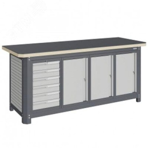 Все металлические элементы покрыты полиэфирной порошковой краской, обеспечивающей хорошую износостойкость покрытия и невосприимчивость его к моющим средствам и смазочным веществам. Верстак имеет декларацию соответствия ТР ТС 025/2012 О безопасности мебельной продукции. Верстак имеет сертификат соответствия ГОСТ Р 58863-2020 Столы производственные. Верстаки из металла. Общие технические условия. Столешница состоит из листа влагостойкой фанеры марки ФСФ толщиной 40 мм, которая покрыта лаком-антисептиком и листом горячекатаной стали толщиной 5 мм. Максимальная масса груза, составляет 1500 кг. Модуль верстака выполнен сварными. Ящики в модулях устанавливаются на шариковых телескопических направляющих полного выдвижения. Модули с ящиками снабжены общим центральным замком с поворотом ригеля 180 градусов и подпружиненной тягой. В комплекте два ключа для каждого замка.