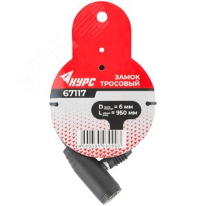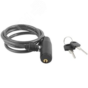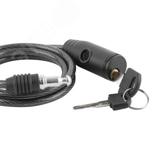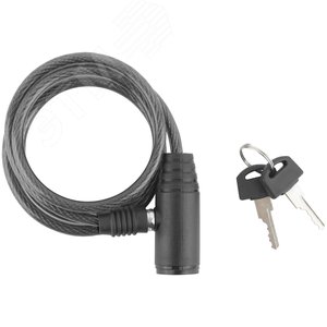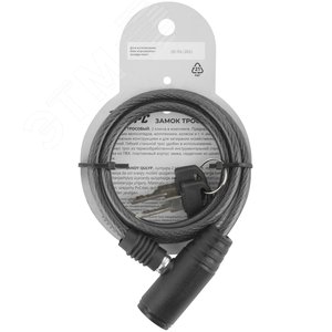 2 ключа в комплекте. Предназначен для фиксации велосипедов, мототехники, колясок и т.п. имущества к неподвижным конструкциями для запирания хозяйственных помещений. Материал - трос из инструментальной стали, оплетка из ПВХ, пластиковый корпус замка, сердечник из цинкового сплава. Упаковка - картонный подвес.