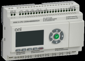 Контроллер для систем ОВК (Отопление, Вентиляция и Кондиционирование) используется для управления компактными вентиляционными установками и может применяться для автоматизации тепловых пунктов. Модуль ЦПУ микро ПЛК ONI с возможностью расширения количества каналов ввода-вывода и коммуникаций с помощью модулей расширения ONI PLR-S. С интегрированным полнофункциональным экраном, 6 дискретными входами, 6 релейными выходами, 1 аналоговым входом (0...20 мА, 0...10 В DC), 5 температурными входами Pt1000, 4 аналоговыми выходами (0...10 В DC). Интегрирован интерфейс RS485 с поддержкой Modbus RTU/ASCII. Напряжение питания 24В AC/DC.