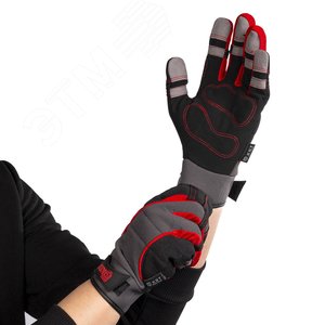 Прочные усиленные перчатки из прочных долговечных синтетических материалов. Поставляются двух размеров - M (8) и L (9). Состав - 50% хлопок, 45% искусственная кожа, 5% PVC. Специальный материал на ладони и пальцах обеспечивает повышенное сцепление перчатки с предметами, предотвращая их выскальзывание. Мягкая вставка на ладони защищает ее от натирания. Мягкая вставка на тыльной стороне перчатки защищает костяшки руки от удара. Прочная застежка-напульсник на липучке обеспечивает удобную подгонку и надежную фиксацию перчатки на руке