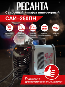 Сварочный инвертор Ресанта САИ-250 ПН предназначен для ручной электродуговой сварки постоянным током (MMA DC) покрытым электродом. Аппарат выполнен по инверторной технологии на базе IGBT-транзисторов, что и предопределяет его превосходные рабочие характеристики. Особенность аппаратов данной серии является расширенный диапазон входного напряжения от 140 В до 240 В.