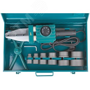 750/1500 Вт, 50-300 градусов по Цельсию, диаметры труб 20/25/32/40/50/63 мм, 3,8/7,5А, 1,6 кг, металлический кейс. Двойной переключатель мощности, три монтажных отверстия, регулировка температуры, 6 комплектов насадок, тефлоновое антипригарное покрытие насадок, алюминиевая нагревательная пластина.