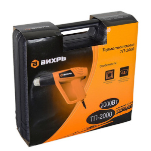 Термопистолет ВИХРЬ ТП-2000 72/2/1 используется при проведении строительно-отделочных работ для сушки и соединения твердых поверхностей. Инструмент работает от электросети (220/50). Строительный фен имеет два режима рабочей температуры - 400 и 550 градусов по Цельсию. Предусмотрено две ступени скорости воздушного потока - 300 и 500 л/мин. Рукоятка удобной формы обеспечивает удобное и надежное удержание инструмента в руке во время работы.