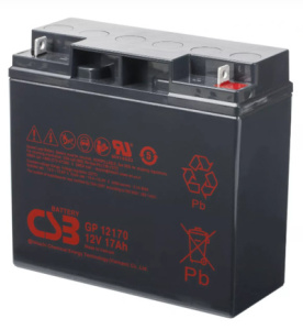 CSB GP 12170 (12 В, 17 Ач) является одним из самых распространенных свинцово-кислотных аккумуляторов общего назначения. Корпус батареи выполнен из долговечного ABS-пластика и имеет предохранительный клапан для сброса избыточного давления. Аккумулятор полностью герметичен (не требует долива воды), а значит может работать в любом положении. CSB GP 12170 выполнен по технологии AGM (стекловолоконный сепаратор, пропитанный жидким электролитом). Срок службы достигает 5 лет или около 260 циклов при 100% разряде. Аккумуляторная батарея CSB GP 12170 имеет усовершенствованную конструкцию легированных кальцием электродов из особо чистого свинца, что обеспечивает продолжительный срок службы и улучшенные разрядные характеристики. Аккумулятор отвечает всем современным требованиям к герметизированным батареям, имеет сертификат соответствия Госстандарта РФ (''Ростест''), заключение ВНИИПО МВД ''О пожаровзрывобезопасности''.