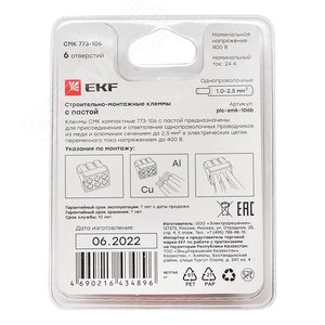 Каждая упаковка содержит по пять клемм. Прочный пластик дает дополнительную защиту изделиям, а лаконичный дизайн с яркими цветами выгодно выделяется на полках магазинов. Антивандальная упаковка полностью запаяна, что исключит ее несанкционированное вскрытие в магазине. Клеммы СМК с пастой EKF предназначены для присоединения и ответвления одножильных проводников из меди и алюминия или многожильного медного провода с наконечником в электрических цепях переменного тока с частотой 50 Гц напряжением до 400 В. Контактная паста автоматически снимает окисную пленку с алюминиевых проводов и предохраняет их от повторного окисления. Клеммы можно использовать при температуре от –40 до +40 C.