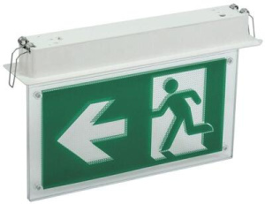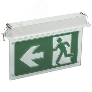 Предназначен для указания путей эвакуации, мест выхода, направления движения и прочих информационных целей в общественных и административных помещениях с низким уровнем содержания пыли и влаги. Знаки сменные. Встраивается в потолки типа Армстронг.