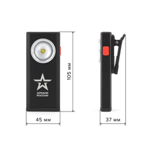 ЭРА RA-802 ''ОФИЦЕРСКИЙ'' входит в серию Армия России совместный проект ЭРА и компании ''Военторг'', действующей на основании лицензии Министерства обороны РФ. Фонарь с емким литиевым аккумулятором 2000 мАч. Корпус изготовлен из алюминия, имеются защитные резиновые вставки. Светоотражатель с линзой для широкого угла освещения. Кнопка включения яркого красного цвета расположена в боковой части корпуса, покрыта мягким прорезиненным материалом. Типы крепления - прищепка для нагрудного кармана, ремня сумки (с внутренними резиновыми вставками, которые надежно фиксируют устройство даже на гладкой скользкой поверхности), встроенный крючок для подвешивания, магнит для закрепления на металлических поверхностях. Фонарь заряжается от USB, кабель в комплекте. Одного полного заряда хватает на 2 часа непрерывного свечения. Есть возможность выбора яркости света. Дальность светового луча - 85 метров.