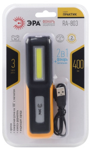 Аккумуляторный светодиодный фонарь ЭРА RA-803 серии `Практик` удобно подзаряжается от microUSB-кабеля, поставляемого в комплекте. Вам не нужно тратиться на батарейки, достаточно просто изредка ставить фонарь на зарядку. Одного полного заряда хватает на 3 часа непрерывного свечения. Есть индикация уровня заряда. ЭРА RA-803 соединяет в себе функции фонаря с дальним направленным лучом и светильника с широким заливающим светом. Удобное устройство в походе, в быту, в работе! Объединяет несколько типов крепления: крючок, клипса-держатель, магнит на ручке. Эргономичная ручка имеет поворотную конструкцию (180°). В фонаре ЭРА `Практик` RA-803 установлен мощный светодиод последнего поколения и плата с яркими минисветодиодами COB. Световой поток этого универсального фонаря 400 лм.
