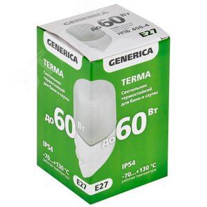Светильник НПБ серии 450 торговой марки GENERICA предназначен для применения в бытовых помещениях с высоким содержанием пыли и влаги, а также с предельной температурой окружающей среды до +130°С, например, в банях и саунах. Светильник имеет полностью керамический корпус и стеклянный плафон, что обеспечивает высокую термическую надёжность и приятный внешний вид. Для уплотнения соединения между корпусом и рассеивателем используется силиконовая прокладка способная выдержать длительную эксплуатацию при высоких температурах, при этом не происходит деформация и высыхание на всем гарантийном периоде эксплуатации. Светильник может быть использован для сквозной проводки, так как имеет 2 гермоввода.