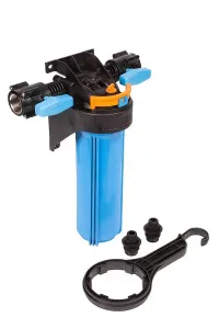 Корпус для картриджного фильтра предназначен для размещения в нём картриджей или фильтрующей засыпки для дальнейшей очистки холодной воды в бытовых условиях. Типоразмер колбы - SlimLine 10. Поворот коллектора на 180град позволяет установить корпус фильтра в магистраль, с направлением движения воды, как слева направо, так и справа налево. Магистральную трубу можно разместить вплотную к стене. Кронштейн является одним целым с крышкой корпуса фильтра. В корпусе предусмотрены специальные технологические отверстия (пробки) для сброса избыточного давления и слива остаточной воды. В комплект поставки входит ключ, с помощью которого можно отвернуть колбу от крышки, а также уплотнительная вставка белого цвета для картриджных элементов без сердечника. На концах коллектора встроены шаровые краны.