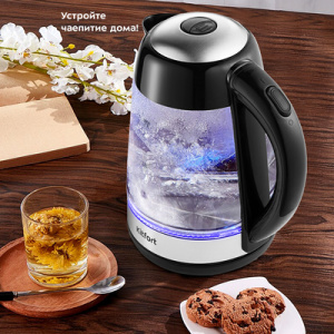 Мощный и вместительный чайник Kitfort КТ-6125 отлично подойдёт для тёплых встреч с семьёй и друзьями. За один раз в чайнике можно вскипятить до 1,7 л воды. Современная конструкция чайника препятствует образованию накипи, облегчает уход, значительно снижает шум при нагревании воды. В носике чайника расположен съёмный фильтр от накипи, который задерживает частички накипи и предотвращает их попадание в чашку. Чайник имеет широкое горлышко и открывающуюся крышку, благодаря чему его быстро и удобно наполнять водой и чистить в случае необходимости. Для удобства использования кнопки включения чайника и открывания крышки находятся на ручке чайника. В кнопку включения/выключения встроен индикатор нагрева. Чайник Kitfort КТ-6125 выполнен из стекла, пластика и нержавеющей стали. Подсветка голубого цвета поможет определить количество воды в чайнике даже в темноте. Мерная шкала нанесена на корпус.