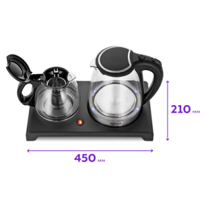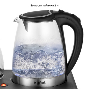 Стильный и функциональный чайный набор Kitfort КТ-6180 состоит из чайника ёмкостью 2 л, кувшина с фильтром для заварки ёмкостью 1,2 л и базы. Набор поможет вам не только вскипятить воду, но и заварить чай или кофе. Корпус чайника выполнен из стекла со вставкой из пластика. Крышка выполнена из сочетания нержавеющей стали и пластика. Конструкция чайника не позволяет ручке нагреваться, поэтому браться за неё безопасно. Кувшин для заварки изготовлен из термостойкого стекла и имеет съёмный фильтр для чая или кофе. В месте установки кувшина на базу присутствует скрытый нагревательный элемент с функцией поддержания тепла. На базе расположена кнопка включения поддержания тепла, а сама база изготовлена из пластика. На ней компактно располагается чайник и кувшин. Небольшие габариты чайной станции позволяют расположить её практически в любое удобное место.