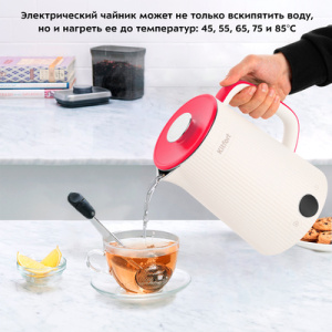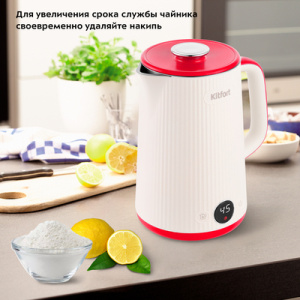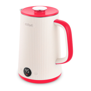 Электрический чайник с электронным терморегулятором Kitfort КТ-6197 может не только вскипятить воду, но и нагреть её до температур - 45, 55, 65, 75 и 85 С. Кнопка ''Вкл/Выкл'' включает и выключает чайник. Кнопка ''Поддержание температуры'' циклически переключает температуру для поддержания 45, 55, 65, 75, 85 С. На дисплее отображается текущая температура воды в чайнике. Корпус чайника и крышка выполнены из пластика, а внутренняя колба чайника и внутренняя часть крышки изготовлены из нержавеющей стали. Съёмная крышка и большое горлышко чайника облегчают доступ внутрь при его мойке и во время удаления накипи. Прибор имеет защиту от перегрева и от включения без воды. Снизу имеется отсек для хранения шнура. Для увеличения срока службы чайника своевременно удаляйте накипь. Для предотвращения накипи используйте фильтрованную воду.